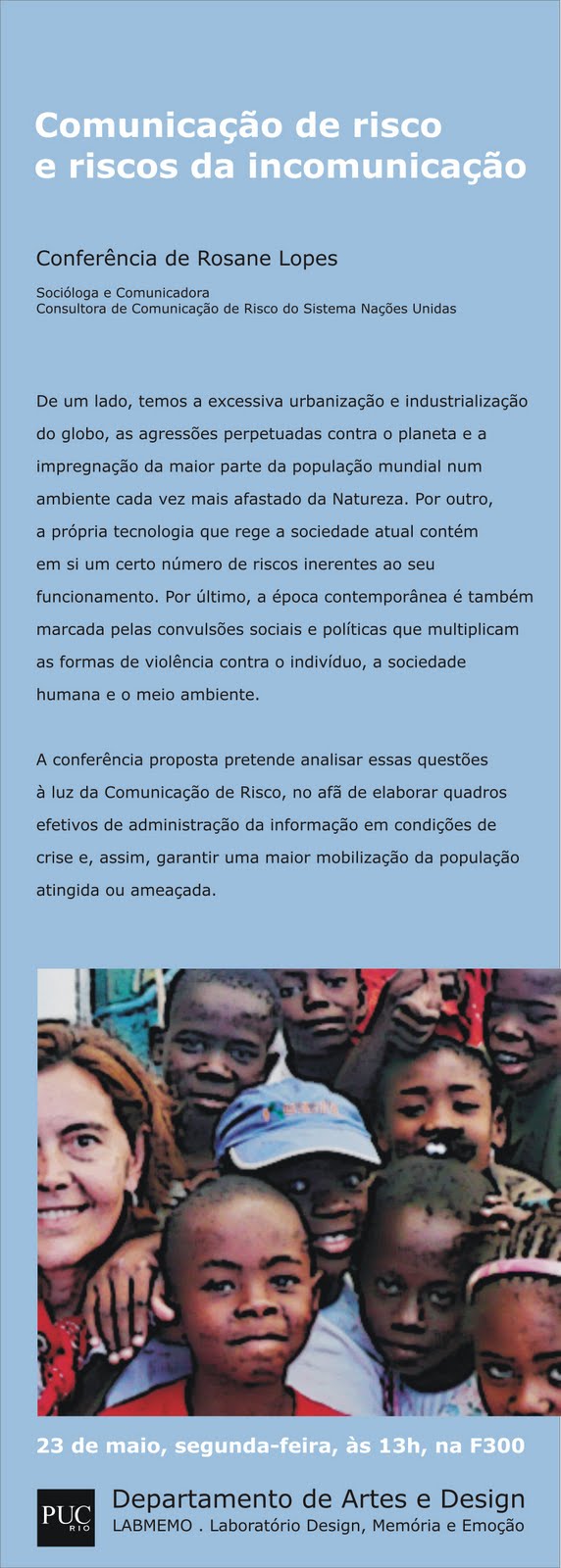 O Deparatamento de Artes e Design da PUC-Rio organizou na tarde do dia 23 de maio, no auditório 300-F, a Conferência "Comunicação de risco e risco da Incomunicação